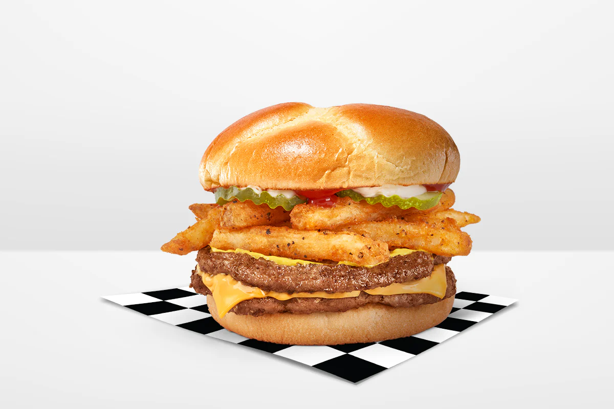 There's no such thing as too many fries. Get two hand-seasoned, 100% beef hamburger patties topped with our Famous Seasoned Fries® and loaded up with American cheese, dill pickles, ketchup, mustard, and mayonnaise on a toasted sesame seed bun.